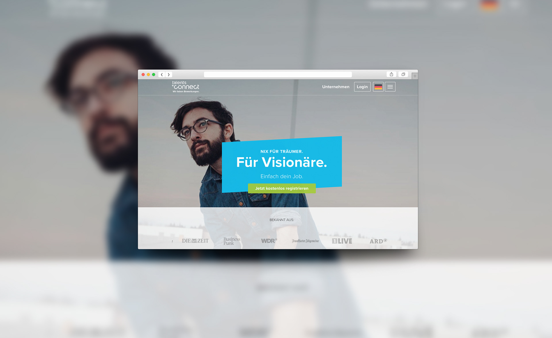 Corporate Design für das Kölner Start-Up „Talents Connect“. Entwicklung des Logos und der grundlegenden Gestaltungskonstanten. Konzeption und Umsetzung der Geschäftsdrucksachen, Vertriebsmaterialien und der Messepräsenz.